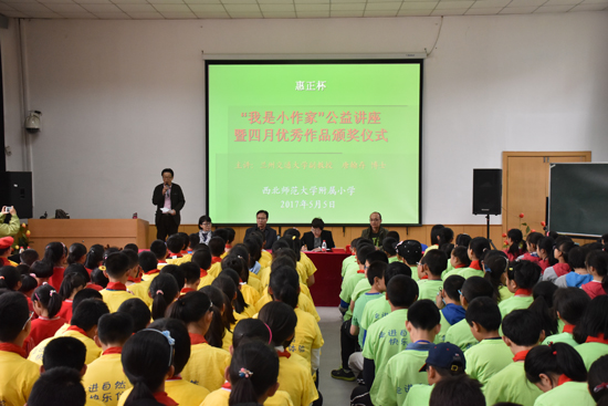 5月5日下午,由兰州市委宣传部、兰州市文明办、兰州日报社、兰州市教育局、兰州市文联联合主办,兰州晚报承办的首届惠正杯“我是小作家”公益讲堂暨兰州市中小学生作文大赛第四期月赛优胜奖颁奖仪式在我校附属小学举行。