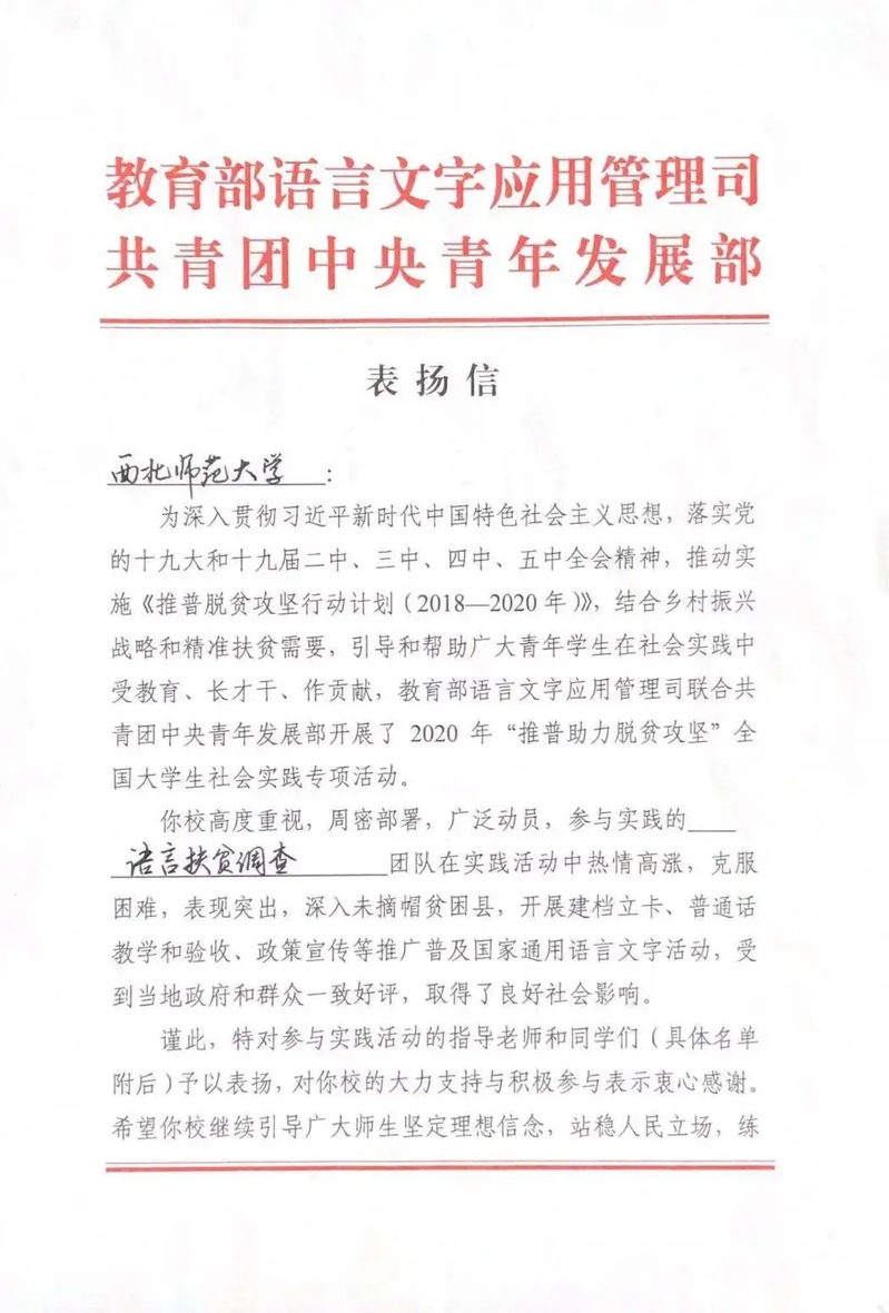 教育部、团中央来信表扬西北师大语言扶贫调查实践团