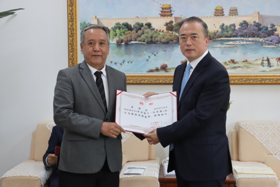 王占仁对吉方高校领导的到访表示欢迎,从办学历史、学科建设、发展现状等方面介绍学校办学情况。他表示,近年来,学校积极主动服务国家“一带一路”倡议,与中亚国家高校的合作广泛深入。学校成立了中亚研究院、吉尔吉斯斯坦研究中心,与吉尔吉斯斯坦国立大学共建吉中“一带一路”研究中心,连续举办“中华语言文化本科学历班”中亚留学生项目,与中亚高校届次化联合举办 “中国与中亚人文交流与合作国际论坛”,组织翻译中亚五国常用法律,与吉尔吉斯斯坦多所高校建立了长期良好的伙伴关系,在学生培养、教师互访、学术和科研合作等方面有坚实的合作基础。会上,王占仁还为化学化工学院特聘教授乌森诺夫·科尼什别克先生、国际文化交流学院特聘教授科兹耶夫·杜鲁斯先生颁发了特聘教授聘书,希望进一步加强校际友好交流,为教育、文化、学科领域贡献更多力量。