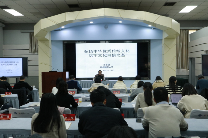 11月28日,党委副书记王全进“弘扬中华优秀传统文化 筑牢文化自信之基”为题,为全校中青年教师授课。